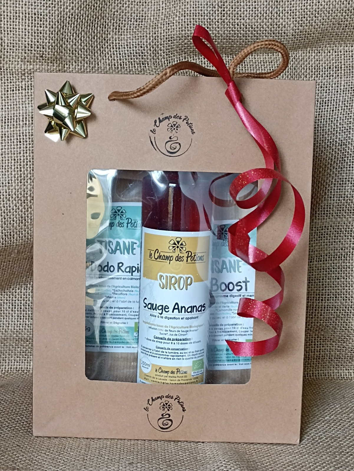 Composez vous-même votre coffret cadeau de 2 tisanes + 1 sirop BIO, à mettre sous le sapin, pour un Noel local et responsable